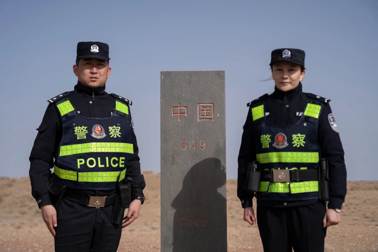 徐乃超與李文娜夫婦身著警服,莊嚴(yán)地站在中國649號(hào)界碑前合影。