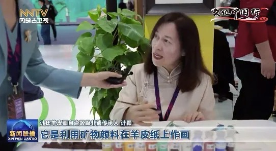 計(jì)氏羊皮畫自治區(qū)級(jí)非遺傳承人 計(jì)穎 作品名稱叫《國色》。它是利用礦物顏料在羊皮紙上作畫,在傳統(tǒng)工藝的基礎(chǔ)上經(jīng)過創(chuàng)新研發(fā),提升了羊皮的經(jīng)濟(jì)價(jià)值和藝術(shù)價(jià)值,做(中華優(yōu)秀)傳統(tǒng)文化的傳承者和傳播者。